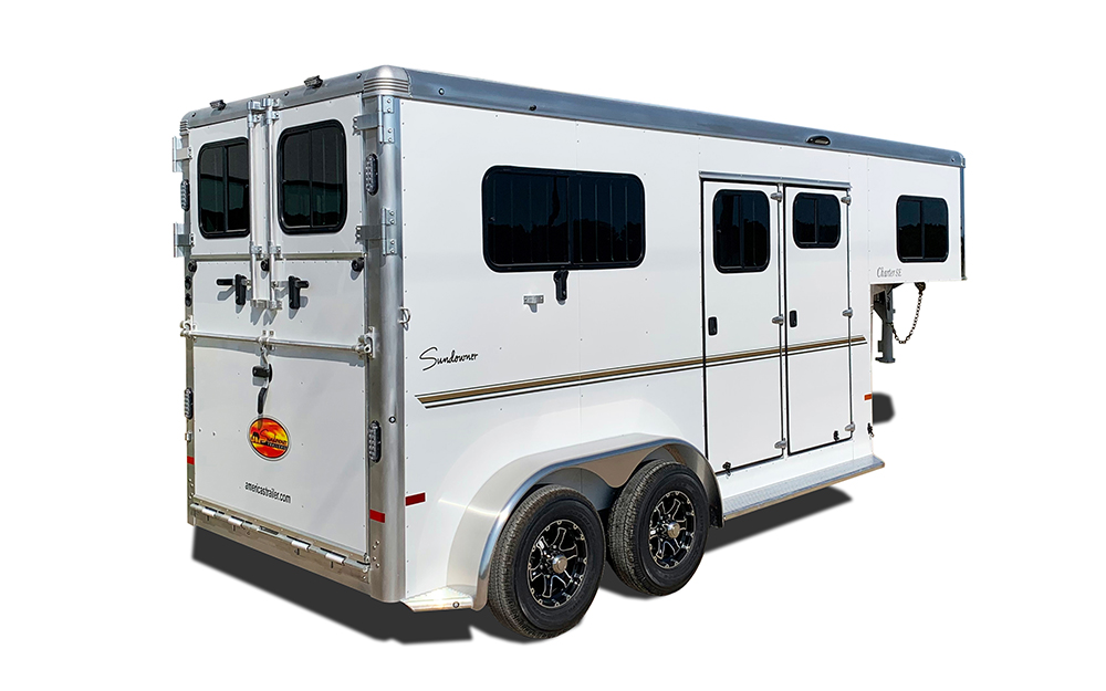 The Charter Gooseneck TR SE is a 2 horse straight load trailer with a large front tack room. It comes standard with two large sliding windows in the horse area, a divider between the stalls, a side access door per stall and are 7’ 6” tall. The Charter TR SE has two saddle racks in the tack room along with two large windows in the nose, a window in the tack door, and it also has windows in the rear tail curtains.