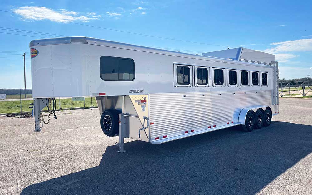 The new Rancher Sport is an all aluminum slant load horse trailer designed for the versatility that many horse enthusiasts are looking for today. This gooseneck trailer is available in a 2 to 10 horse model. It has drop down feed doors on the head side and Plexiglas on the rump side and rear doors. The Rancher Sport has removable dividers, rubber floor mats and comes with a front tack storage room. The Rancher Sport is built with the same quality and standards that people have come to expect from Sundowner.